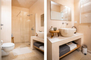 On the ground floor, you will find 4 bedrooms, 2 of which are standard rooms. These small but cozy rooms can accommodate 2 people. Each room has a separate entrance from the side of the pool. Of course, you can use all facilities indoors and outdoors (living areas, kitchens, etc.). Each room has its own bathroom, where you will find a walk-in shower, toilet, towels, hairdryer, and luxurious unisex products from Marie-Stelle-Maris: shampoo, conditioner, body wash, and hand soap. Hammam and towels for the pool are also available here. Our beds are of the highest quality, hypoallergenic, and sleep wonderfully! Upon arrival, there is water in the room, and our refrigerators in the kitchens are stocked with various drinks and snacks. You will also find our menu in the room.