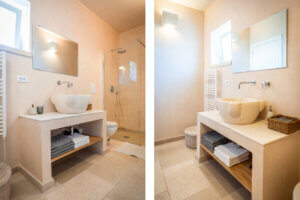 On the first floor, you will find two bedrooms, our Panoramica Suites. Both suites have direct access to the living area, which includes the kitchen, lounge, and dining space. From here, you can also reach the panoramic terrace, which offers a stunning view over the Itria Valley.