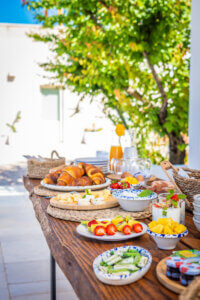 In onze B&B formule is het ontbijt uiteraard inclusief en serveren we elke ochtend een uitgebreid buffet aan het zwembad met verse producten uit onze regio. Fruit, yoghurt, noten, granola, vleeswaren, kaas, eitjes, omelet, pannenkoekjes, lokale specialiteiten… voor ieder wat wils! In sommige maanden hebben we overheerlijk fruit uit onze eigen tuin: abrikozen, pruimen, vijgen, cactusvijgen… zongerijpt, puur natuur op je bord.