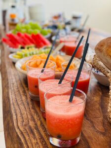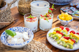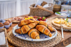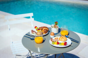 In onze B&B formule is het ontbijt uiteraard inclusief en serveren we elke ochtend een uitgebreid buffet aan het zwembad met verse producten uit onze regio. Fruit, yoghurt, noten, granola, vleeswaren, kaas, eitjes, omelet, pannenkoekjes, lokale specialiteiten… voor ieder wat wils! In sommige maanden hebben we overheerlijk fruit uit onze eigen tuin: abrikozen, pruimen, vijgen, cactusvijgen… zongerijpt, puur natuur op je bord.