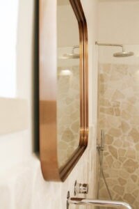Elke kamer beschikt over een eigen badkamer, ingericht met inloopdouche en toilet. Hier vind je zachte handdoeken, een haardroger en een exclusieve selectie unisex verzorgingsproducten van Marie-Stella-Maris, waaronder shampoo, conditioner, body wash, body lotion en handzeep. Daarnaast liggen er hammamdoeken en handdoeken klaar voor het zwembad.