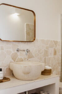Elke kamer beschikt over een eigen badkamer, ingericht met inloopdouche en toilet. Hier vind je zachte handdoeken, een haardroger en een exclusieve selectie unisex verzorgingsproducten van Marie-Stella-Maris, waaronder shampoo, conditioner, body wash, body lotion en handzeep. Daarnaast liggen er hammamdoeken en handdoeken klaar voor het zwembad.