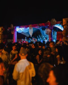 Kleurrijke hippieachtige beach club, food trucks, bar, lounge area en muziek events.