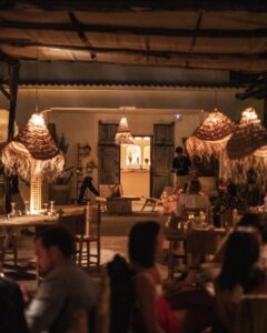 Bohemian beach bar waar je ook kan lunchen en dineren.