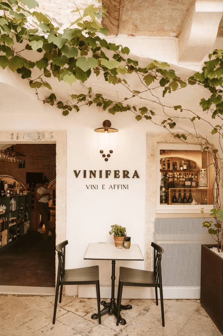 Vinifera – Vini e Affini is een sfeervolle wijnbar en winkel gelegen in het hart van Locorotondo. Vinifera staat bekend om zijn uitgebreide selectie van meer dan 500 wijnlabels, waaronder lokale Pugliaanse wijnen, nationale en internationale variëteiten. Naast wijnen biedt de enoteca een rijke keuze aan distillaten, likeuren en zorgvuldig geselecteerde gastronomische producten.